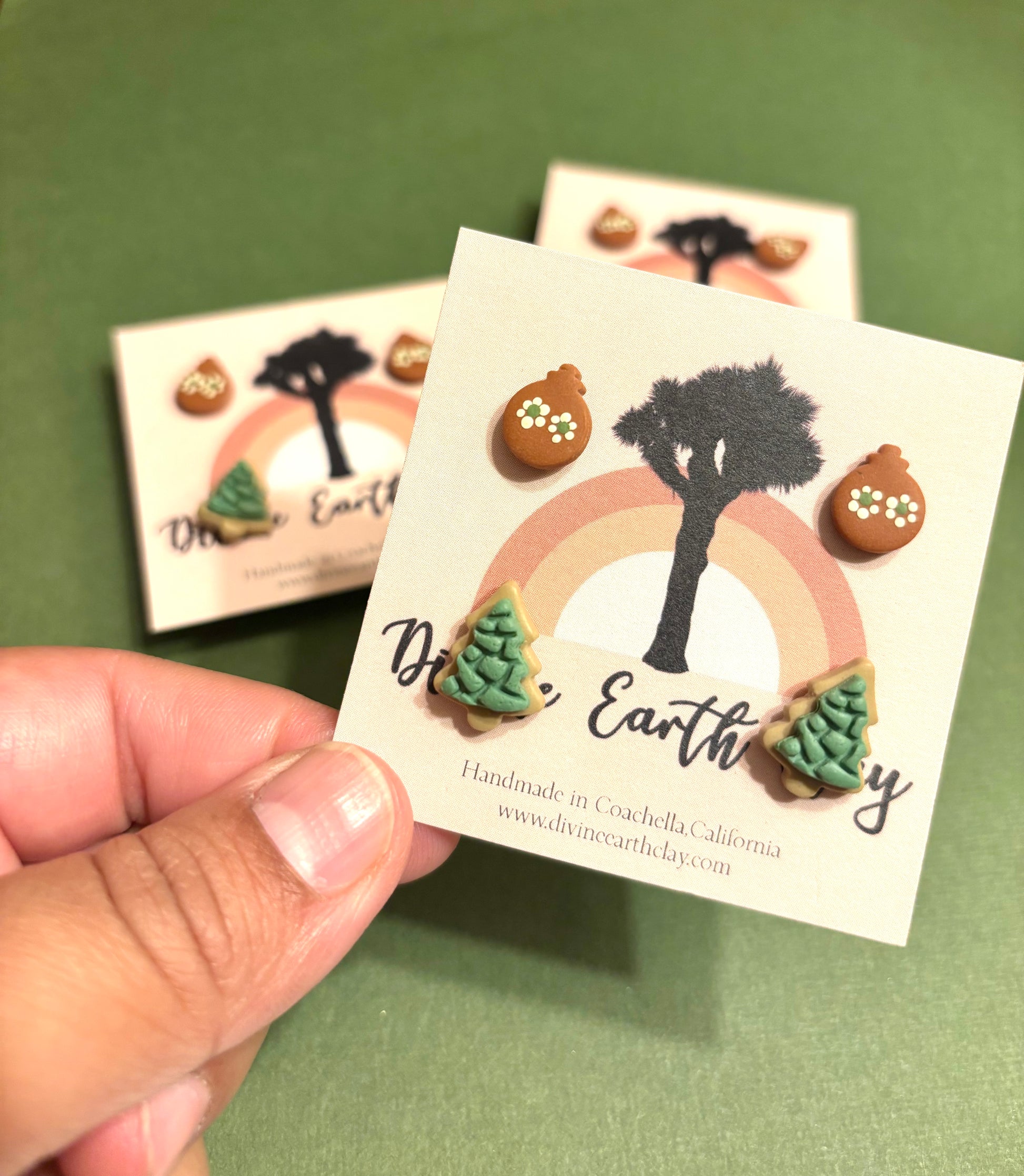 "Upgrade your holiday ensemble with our Esfera de barro and Concha Christmas tree stud pack. These handmade polymer clay pieces are not only adorable, but also lightweight and hyper-allergenic. Perfect for any festive occasion."