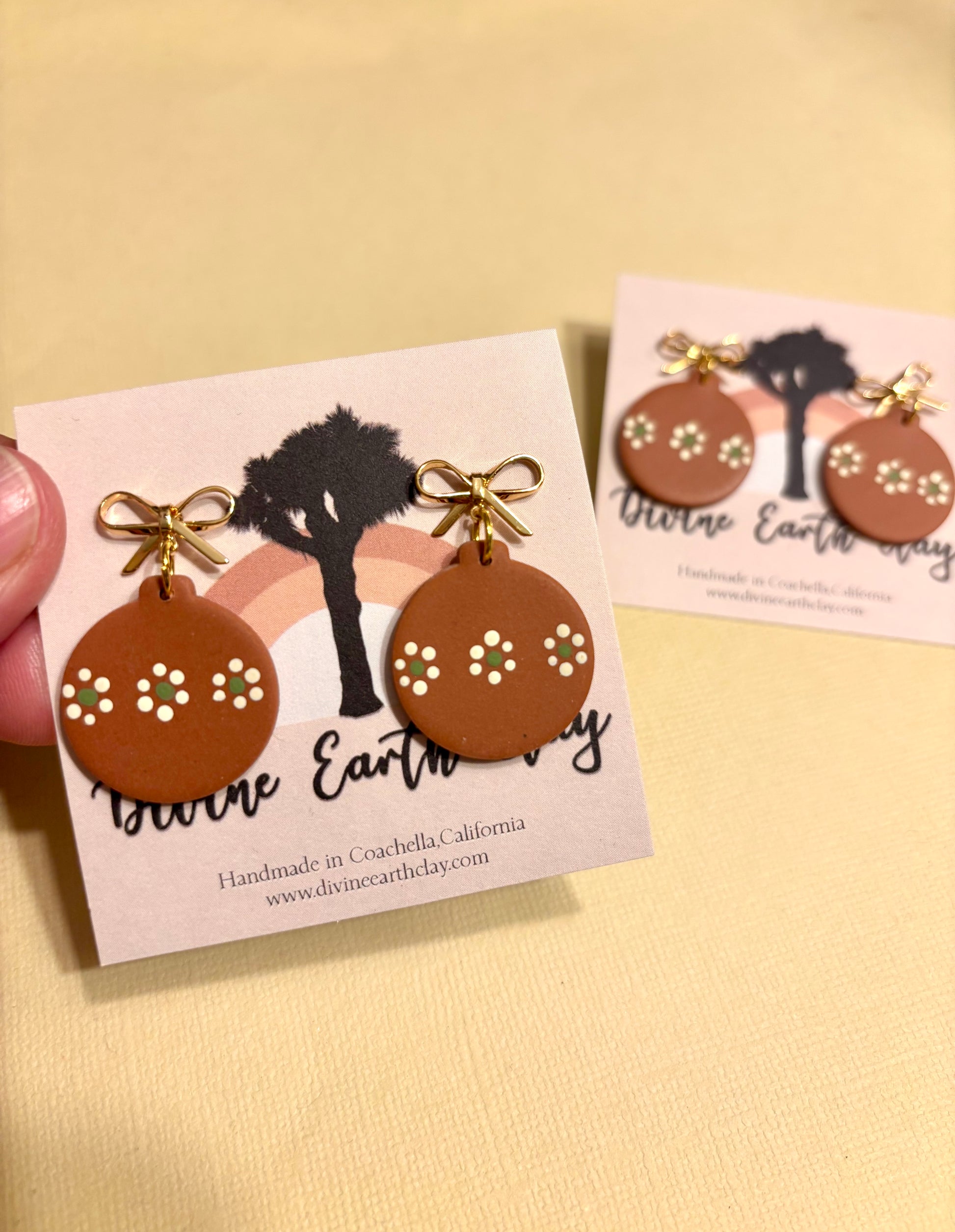 These Esferas de barro are handmade from polymer clay, and feature a beautiful 18k bow design. Inspired by Mexican Christmas festivities, these unique pieces add a touch of culture and elegance to any outfit. Show off your style with these one-of-a-kind accessories.