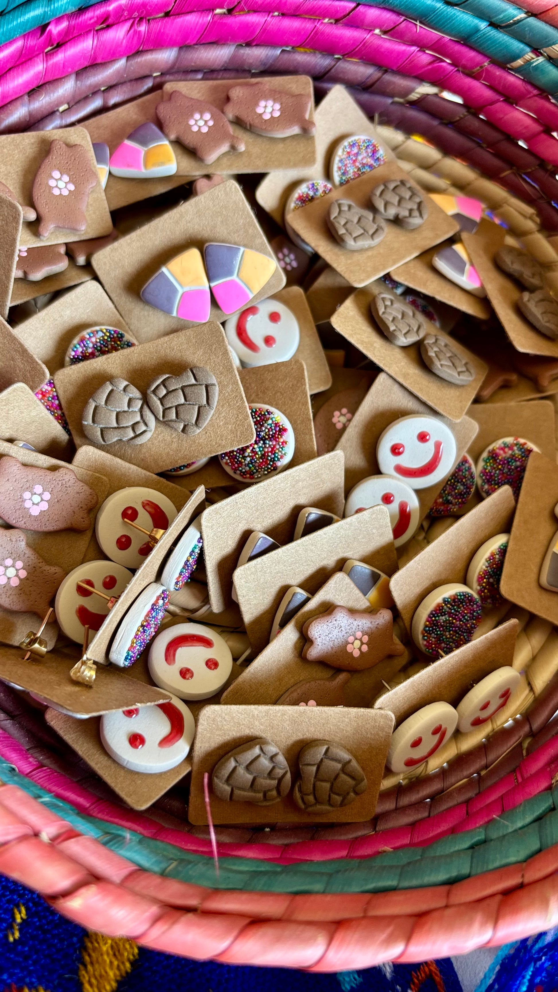Experience the joy and love of our cultura with these Mexican Pan Dulce stud earrings. Handcrafted from polymer clay, these unique earrings are a must-have for any pan dulce lover. Show off your cultural pride with these one-of-a-kind earrings.
