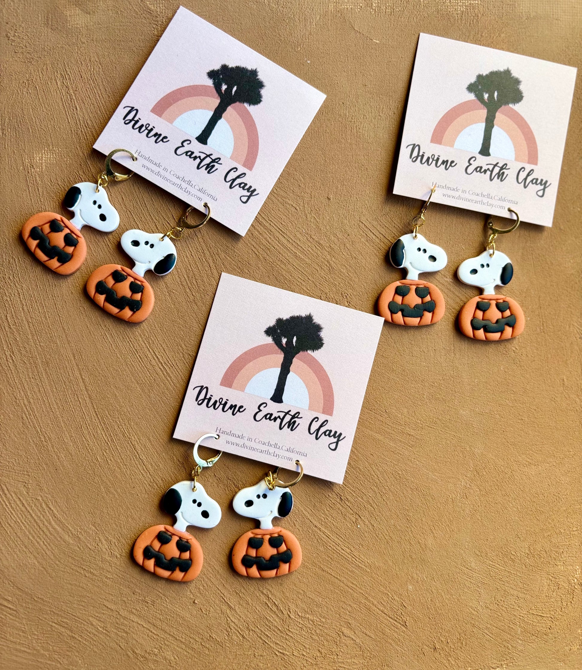 Expertly handcrafted using polymer clay, our Snoopy Dangle earrings feature everyone's favorite beagle in a cheerful pumpkin design. Add a touch of whimsy and nostalgia to any outfit with these unique earrings.